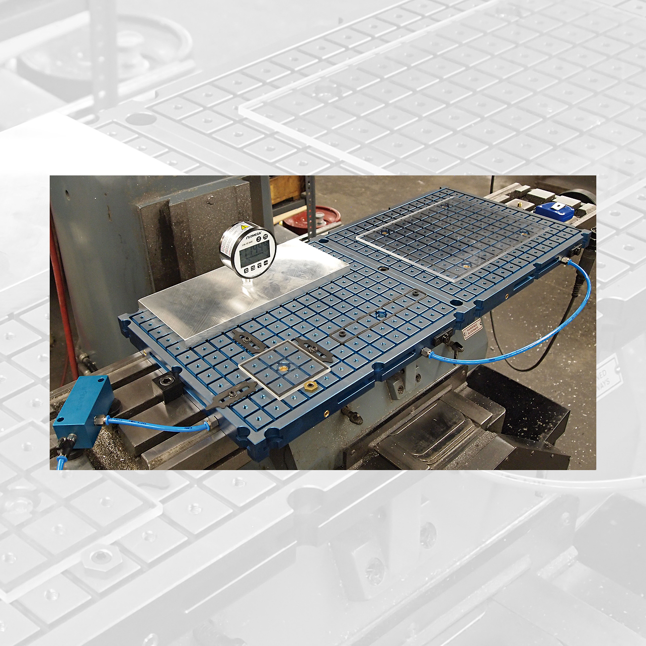 Piano da 350 x 400 mm retinato e forato in M6 per permettere molteplici soluzioni di staffaggio. La retinatura crea  un attrito maggiore e quindi garantisce una maggiore tenuta del pezzo