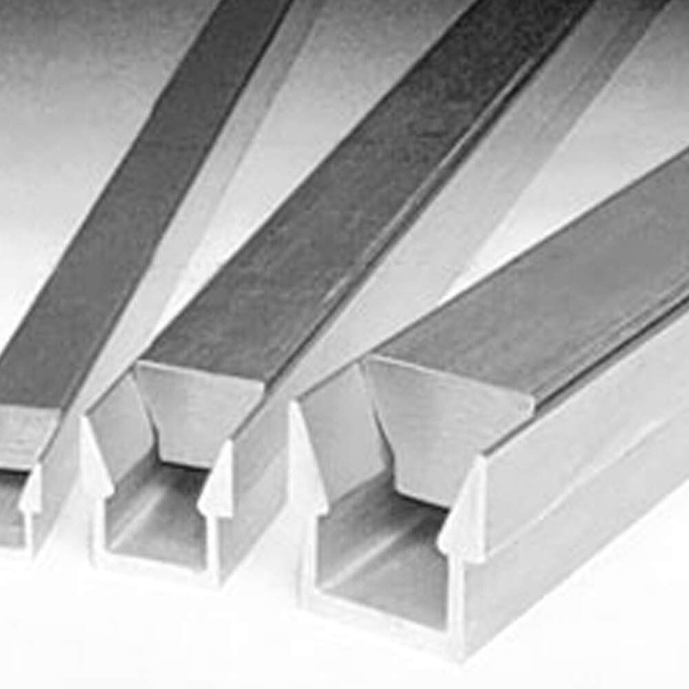 Particolari UNIFORCE grezzi da utilizzare nella lunghezza desiderata. La lunghezza di questi particolari è di 508 mm per tutte le misure. La base a “U” è in alluminio, il cuneo in acciaio.