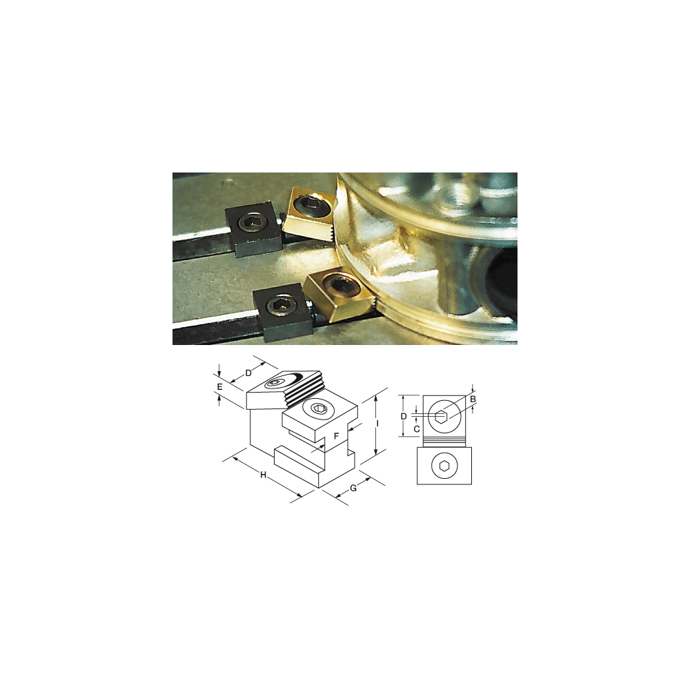Questi morsetti oltre ad una tenuta migliore sulla tavola aggiungono una forza di bloccaggio addizionale. L’elemento di bloccaggio inclinato assicura una forza verticale di serraggio di 1.800 Kg. L’elemento di staffaggio, in acciaio temperato ha due facce. Una liscia per staffare pezzi lavorati ed una zigrinata per staffare pezzi grezzi.