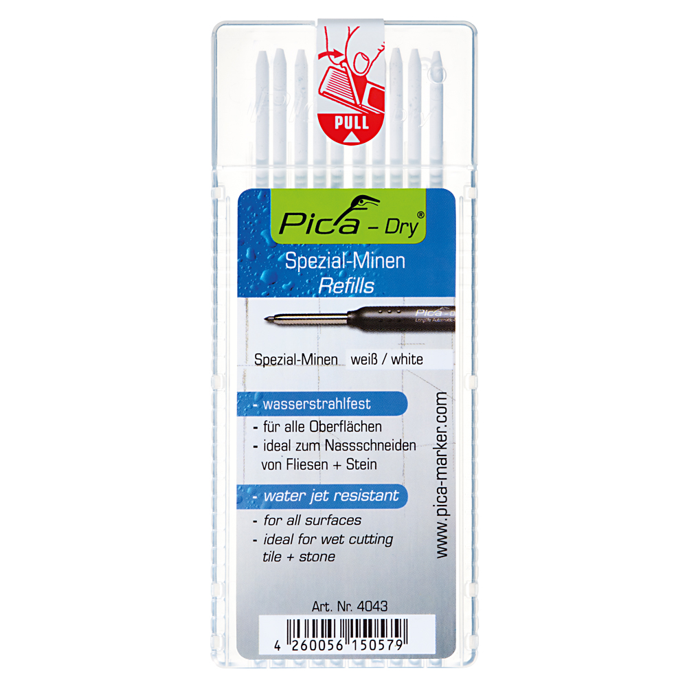 Pica Dry è il marcatore professionale per l'edilizia adatto a quasi tutte le superfici. Sia che si tratti di superfici asciutte o umide, lisce o ruvide, polverose o arrugginite, grazie all'ampia gamma di mine, si è attrezzati al meglio per ogni progetto.