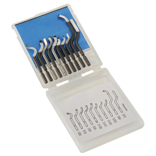 Assortimento di dieci differenti lame del tipo "S" da 3,2 mm che permette di provare le diverse lame e trovare la migliore per la propria lavorazione. Da utilizzare con impugnatura UNI NG1000, supporto  SN o con gli sbavatori a lame intercambiabili del tipo "S".