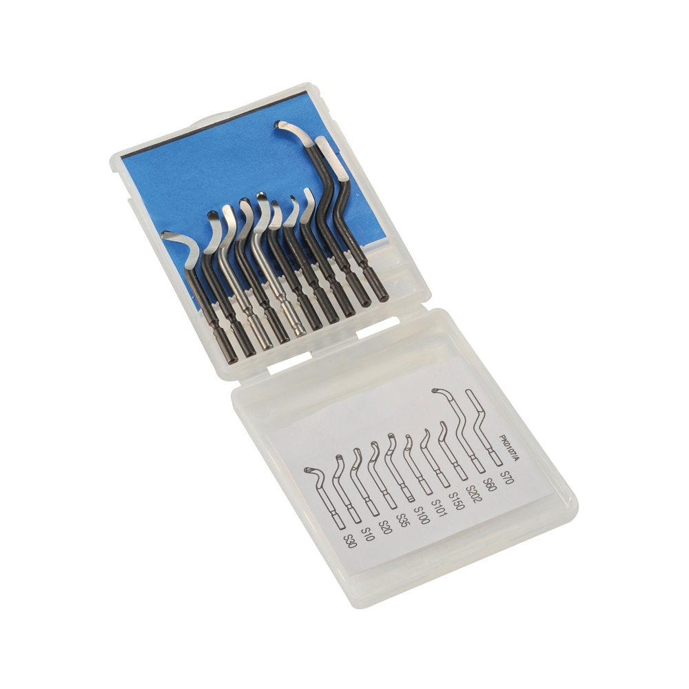 Assortimento di dieci differenti lame del tipo "S" da 3,2 mm che permette di provare le diverse lame e trovare la migliore per la propria lavorazione. Da utilizzare con impugnatura UNI NG1000, supporto SN o con gli sbavatori a lame intercambiabili del tipo "S".
