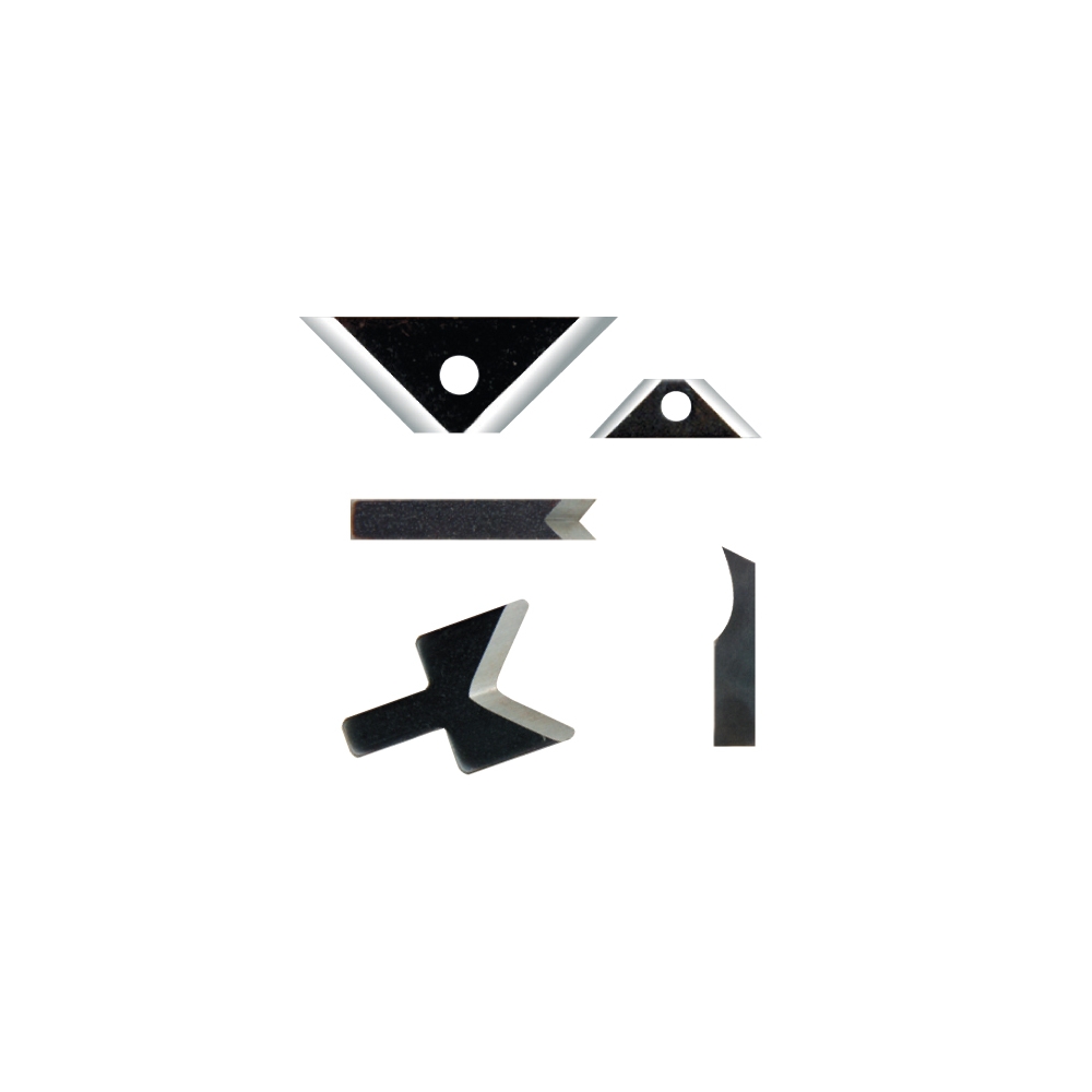 Lame per differenti applicazioni. Lame reversibili tipo R per raschietti, lame tipo L per sbavature simultanee, lame tipo C per svasature a 90° e lame rotonde per sbavatore DOUBLE e KEYWAY.